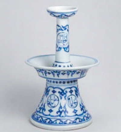 這是一件明正德年間的青花燭臺(tái)。燭臺(tái)很復(fù)雜,由四部分組成,最上端為蠟燭插口,外壁繪如意云頭紋;其下為燭臺(tái)細(xì)長(zhǎng)支柱,中部繪圓形開(kāi)光,開(kāi)光內(nèi)書寫阿拉伯文,上下分別繪勾蓮花枝紋及菱形紋。再下為承托圓盤,也繪如意云頭紋;最下端為喇叭形臺(tái)座,也繪圓形開(kāi)光,開(kāi)光內(nèi)書寫阿拉伯文,開(kāi)光上下分別繪勾蓮花枝紋及菱形紋。燭臺(tái)上的阿拉伯文與傳統(tǒng)紋飾,表現(xiàn)出阿拉伯文化與中華傳統(tǒng)文化的交融。
