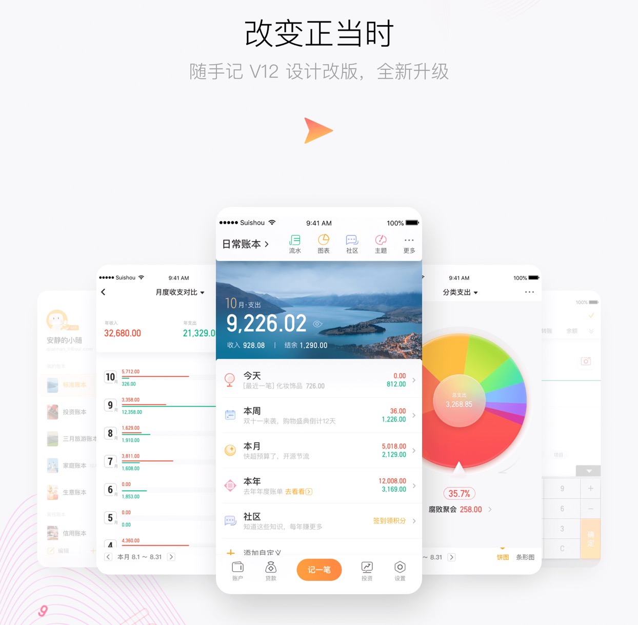 隨手記V12版本對(duì)界面進(jìn)行了全新的優(yōu)化升級(jí),整體風(fēng)格選擇了淺色為主亮色為輔的設(shè)計(jì),logo更扁平化,更顯輕松活潑,符合年輕人群記賬的調(diào)性。