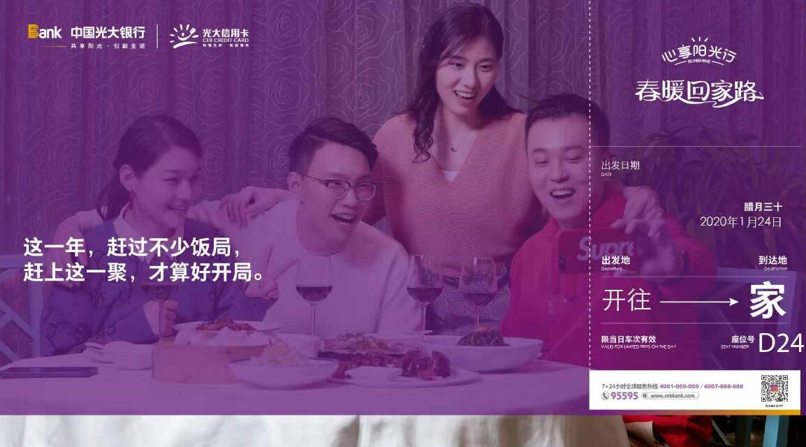 此次“春暖回家路”活動將在全國多地同步開展,圍繞餐飲、出行、娛樂等多種春節(jié)期間關(guān)鍵場景,光大信用卡推出十余個優(yōu)惠活動,包括國內(nèi)機票優(yōu)惠立減、旅游線路優(yōu)惠立減、10元購50元飯票、18元購50元滴滴專車權(quán)益包、口碑優(yōu)惠滿減、口碑APP滿額減等?;顒又攸c從“回家路途”延伸到“回到家后”,涵蓋團(tuán)圓、走親訪友等各類場景,其中針對年夜飯場景特別推出新春主題榜單、藏寶小鎮(zhèn)兌紅包、餐飲主題快閃店三大核心玩法。此外,2020年是全面建成小康社會的決勝之年,“擁軍愛國送溫暖”等公益行動同步開展,讓“關(guān)愛”“正能量”成為2020年春節(jié)的關(guān)鍵詞。