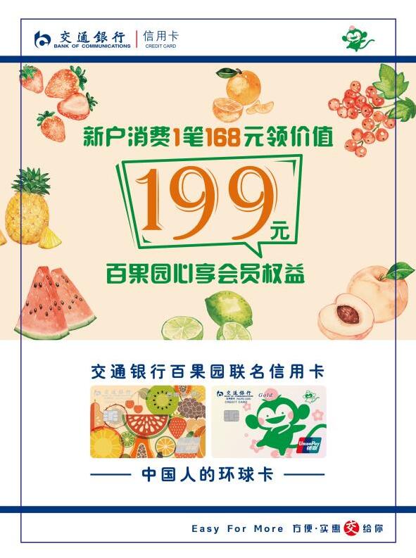 這款卡片不僅卡面超可愛,有五彩繽紛的水果圖案,也有百果園的猴果果logo,元?dú)鉂M滿;福利也很硬核,現(xiàn)在辦理交通銀行百果園聯(lián)名信用卡,新戶達(dá)標(biāo)就可以免費(fèi)領(lǐng)價(jià)值199元百果心享會(huì)員年卡,擁有它就擁有百果園的上千元權(quán)益!