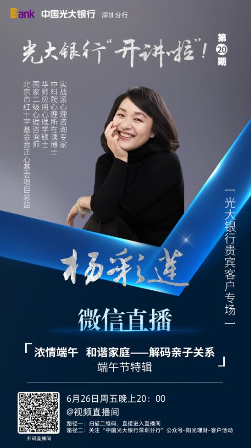 見圳客戶端·深圳新聞網2020年6月24日訊 端午節(jié)臨近,光大銀行深圳分行將攜手深圳熱線于6月26日,在線開展第二十期《光大銀行"開講啦“!》公益課堂。