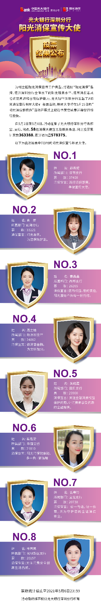 深圳新聞網(wǎng)·見(jiàn)圳客戶(hù)端2021年5月8日訊 昨日,光大銀行深圳分行“陽(yáng)光消保宣傳明星大使”線(xiàn)上投票圓滿(mǎn)結(jié)束,從58名宣傳大使中投票產(chǎn)生了賴(lài)春妮、肖雨、曹晶晶、周之靖、黃曉霞、蔣易萱、曾粵玲、林思思8名陽(yáng)光消保宣傳明星大使。明星大使將在5月15日的“陽(yáng)光消保健康跑”活動(dòng)開(kāi)幕式上被授予榮譽(yù)勛章并接受行領(lǐng)導(dǎo)授旗。5月1日,光大銀行深圳分行發(fā)起了“陽(yáng)光消保宣傳明星大使”線(xiàn)上投票,旨在樹(shù)立起陽(yáng)光消保宣傳工作典型,打造“陽(yáng)光消?!逼放?,提升深圳分行全體員工的陽(yáng)光服務(wù)水平,提高消費(fèi)者風(fēng)險(xiǎn)防范意識(shí)和自我保護(hù)能力,提升光大在深圳地區(qū)的品牌影響力。投票活動(dòng)得到社會(huì)熱烈響應(yīng),據(jù)統(tǒng)計(jì),此次累計(jì)票數(shù)達(dá)363388次。