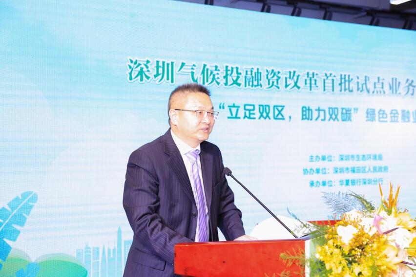 國(guó)家生態(tài)環(huán)境部氣候司司長(zhǎng)李高,深圳市政府副秘書(shū)長(zhǎng)劉昂,深圳市生態(tài)環(huán)境局局長(zhǎng)李水生,深圳市委改革辦副主任孫華明,福田區(qū)政府副區(qū)長(zhǎng)朱江,華夏銀行總行黨委委員、營(yíng)銷(xiāo)總監(jiān)、深圳分行黨委書(shū)記、行長(zhǎng)陳傳龍等領(lǐng)導(dǎo)出席。深圳市政府、深圳市生態(tài)環(huán)境局、市委改革辦、中國(guó)人民銀行深圳市中心支行、福田區(qū)政府相關(guān)負(fù)責(zé)人、深圳市綠色企業(yè)代表、深圳市綠色相關(guān)行業(yè)協(xié)會(huì)代表、華夏銀行深圳分行相關(guān)單位代表等70余人參加活動(dòng)。