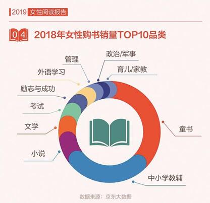 京東大數(shù)據(jù)顯示,女性的讀書量顯著提升,2018年,女性讀者人均購書7.6本,高于男性,女性讀者在紙質(zhì)書購買上的人均消費(fèi)近230元,女性的“閱讀力”正在變得越來越強(qiáng)。從圖書銷量上看,2018年女性讀者購買最多的圖書是童書、中小學(xué)教輔、小說、文學(xué)和考試,可見對于大部分女性而言,購書的主要目的是出于育兒的需求。
