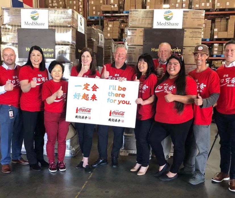 可口可樂中國及韓國區(qū)總裁馮廣晟(左五)與可口可樂公司及裝瓶合作伙伴的志愿者出席了在MedShare總部的物資啟運儀式