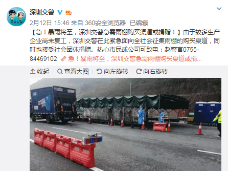 見(jiàn)圳客戶端·深圳新聞網(wǎng)2020年2月14日訊 2月12日下午約4時(shí),深圳交警官方微博的一條消息牽動(dòng)了深圳紅牛負(fù)責(zé)人張健明的心。該微博寫(xiě)道:“急!暴雨將至,由于較多生產(chǎn)企業(yè)尚未復(fù)工,深圳交警在此緊急面向全社會(huì)征集雨棚的購(gòu)買渠道,同時(shí)也接受社會(huì)團(tuán)體捐贈(zèng)?!?/span>