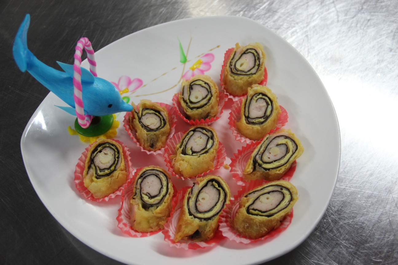 做法:將鮮蝦去殼拆肉,用菜刀輕輕碾壓之后,加入少量精鹽拌勻,于鋁制小碗中不停搓攪。打蝦膠時(shí)手必須朝同一方向攪拌,這樣蝦肉才會(huì)粘連起膠;否則卻可能破壞粘度,口感亦不夠爽脆。然后,打碎雞蛋,于平底鍋中烙出一塊塊金黃色雞蛋皮,并連同大片紫菜各各切成正方形片狀。將紫菜片放于雞蛋皮上,取蝦膠均勻涂抹于紫菜表面,蓮子整齊擺放于一端,以其為圓心卷裹成圓條。整條放入中溫油鍋,微炸至表面金黃即撈起瀝油,斜刀切成厚片直接裝盤(pán)。