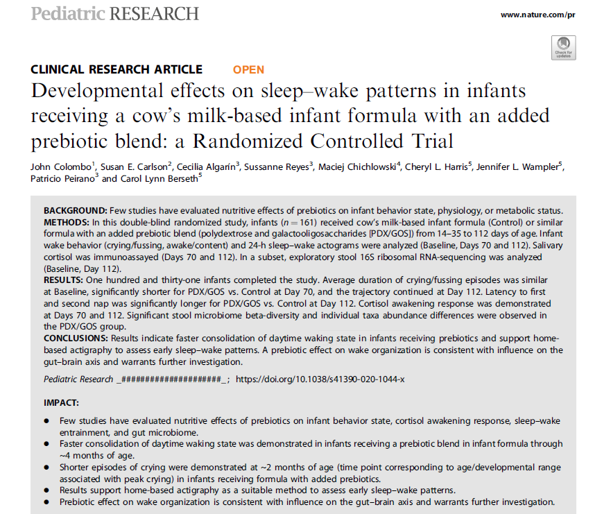 近日,全球知名科學期刊出版集團自然旗下的 《兒科研究》刊發(fā)最新研究成果顯示,添加PDX+GOS長短鏈益生元組合的配方奶粉能夠加快嬰兒睡眠模式成熟,增加清晨清醒時間,減少寶寶哭鬧,尤其是夜間哭鬧。這一研究采用了雙盲隨機對照的臨床研究方式,率先揭示了寶寶睡眠與腸道營養(yǎng)之間的奧秘,因而引起行業(yè)高度關(guān)注。