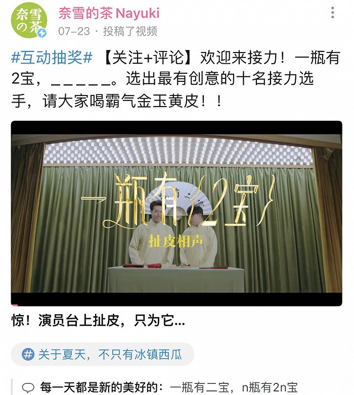 在此之前,奈雪曾用“說相聲”的方式推霸氣金玉黃皮,讓茶飲和相聲組CP;霸氣生椰斑斕上架時(shí),他們出了個(gè)東南亞風(fēng)滿滿的視頻,仿佛一秒到了泰國,創(chuàng)意有趣的同時(shí),也讓消費(fèi)者對產(chǎn)品留下深刻印象。
