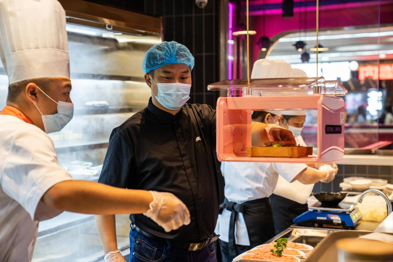 值得一提的是,除了地道的火鍋美食,這家餐廳的特別之處,在于高科技智能機(jī)器人的廣泛應(yīng)用。在餐廳過(guò)道里,一款名為“蠶豆”的配送機(jī)器人來(lái)回奔忙,把各式菜品有條不紊地送達(dá)顧客桌前。半空中,高效穿梭的云軌小車將菜品傳送到餐桌,“從天而降”呈現(xiàn)在顧客面前,科技體驗(yàn)感十足。這款“天降”智能云軌傳輸系統(tǒng),由智能配餐、智能云軌兩大模塊構(gòu)成。顧客通過(guò)手機(jī)下單后,智能配餐系統(tǒng)接到指令,能自動(dòng)將相應(yīng)菜品餐食分配給云軌小車,高效、快速地配送到對(duì)應(yīng)餐桌,整個(gè)送餐過(guò)程實(shí)現(xiàn)“零接觸”,在高效率的同時(shí),確保了安全衛(wèi)生。