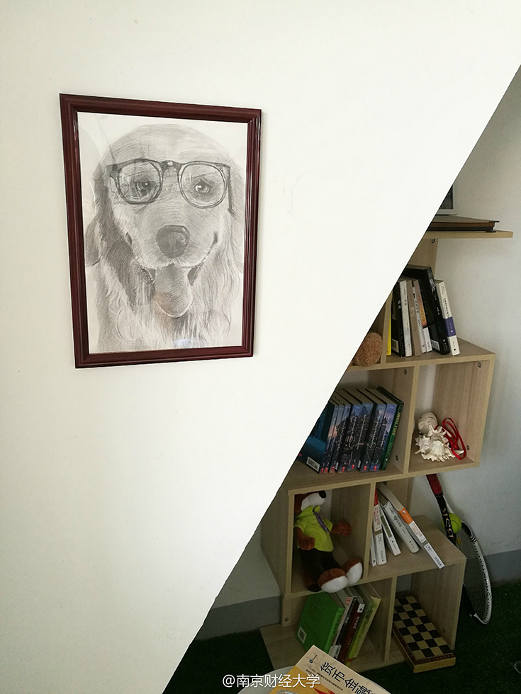 墻上一幅戴著眼鏡的小狗素描圖格外引人注目,它是由602舍長(zhǎng)涂貴平親手畫(huà)的?!斑@幅畫(huà)還是去年自己參加了一個(gè)帶有公益性質(zhì)的畫(huà)畫(huà)班學(xué)的,我也沒(méi)想到能畫(huà)成這樣。”來(lái)自貴州的涂貴平害羞地說(shuō),其實(shí)裝飾寢室的初衷很簡(jiǎn)單,錢(qián)就花了300塊不到,主要是希望大學(xué)四年能住在干凈的環(huán)境。