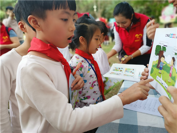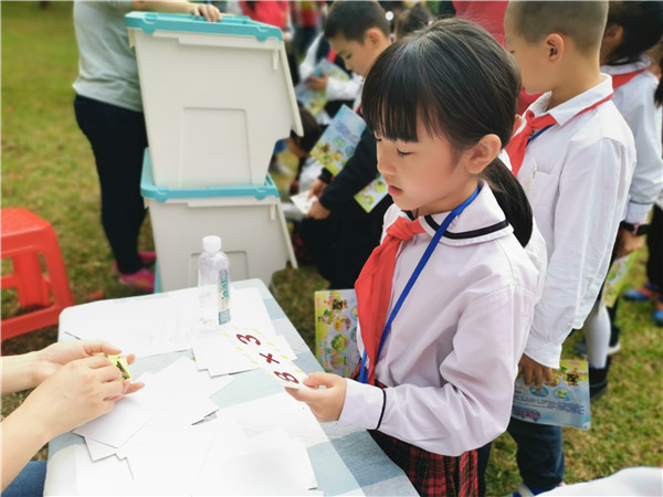 據(jù)悉,本次活動以闖關(guān)的形式,每年級各分10個關(guān)卡,每闖一關(guān)就獲得一個能量動物或者能量植物填補闖關(guān)卡的空白,各年級的學生需要在半小時內(nèi)將闖關(guān)卡的空白處填滿,才算闖關(guān)成功,獲得有校長贈言的書籍一本。關(guān)卡的設(shè)置以語文、數(shù)學和英語三個科別組成,其中,最受孩子們青睞的要數(shù)“筆架說話”這個關(guān)卡,孩子們把自己相像成筆架山的一員,然后介紹自己,有同學說:“我是筆架山的大樹,我可以給大家遮蔭,讓大家不用被太陽曬到?!薄ⅰ拔沂枪P架山的石頭,孩子們來筆架山玩的時候,可以把我們拼在一起做拼圖。”、“我想成為筆架山的暗綠繡眼鳥,就是嘴巴尖尖的,頭上綠綠的,眼睛邊上有點白色的那種,我要站在筆架山的枝頭上盡情歌唱,紅紅的火焰花為我做背景!”......孩子們通過豐富的相信力,盡情在老師與家長義工面前展現(xiàn)臨場的表達能力。