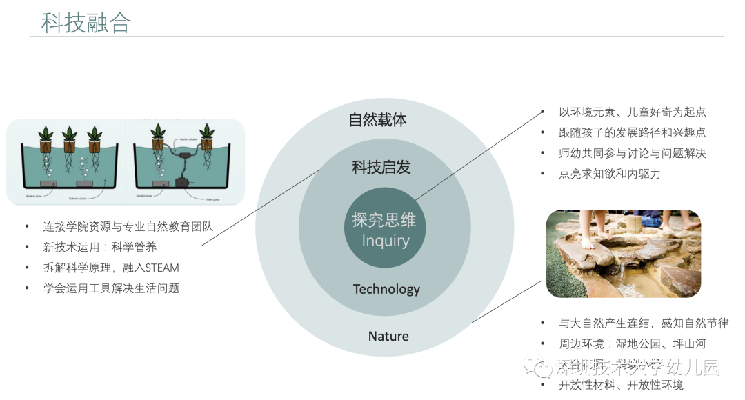 園舍內(nèi),聯(lián)動(dòng)大學(xué)學(xué)院資源和專業(yè)自然教育團(tuán)隊(duì)打造自然教育場(chǎng)所,使得科技與自然在幼兒環(huán)境中有機(jī)結(jié)合。自然在前,技術(shù)運(yùn)用在后,孩子將用探究的眼光發(fā)現(xiàn)如何運(yùn)用技術(shù)解決生活問(wèn)題。