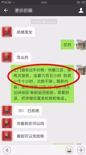 受害人看到招嫖信息主動聯(lián)系時,騙子立即承諾服務內(nèi)容,讓受害人悠然神往,喪失理智。