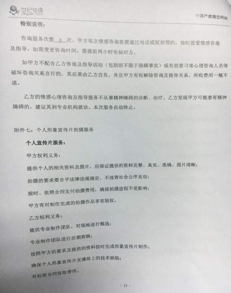 根據(jù)合同,目前服務(wù)時(shí)間已經(jīng)終止,但還有心理咨詢服務(wù)及個(gè)人宣傳片兩項(xiàng)增值服務(wù)未履行。朱女士對此解釋,這是屬于不收費(fèi)的增值服務(wù),需要客戶自己提出才會(huì)進(jìn)行?!皼]有人跟我說過這個(gè)需要自己提出要求?!眲⑿〗銓υ撜f法并不買賬。