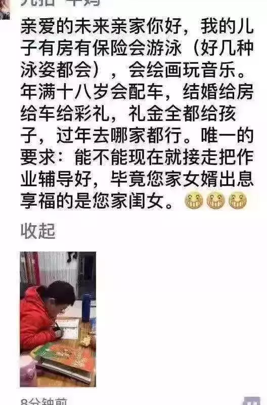 這兩天刷爆朋友圈的一種特殊的文體在朋友圈火了起來,這些文章都是寫給未來的親家的,文章開頭先是對自家娃大力夸獎一番,什么有房有車、會游泳、婚禮豪配等要素,一個都不落下;文章的最后提出唯一的要求,那就是把娃現(xiàn)在就接走。這些文章充分顯示了家長在輔導(dǎo)自己孩子做作業(yè)的時(shí)候,心情不太舒暢。