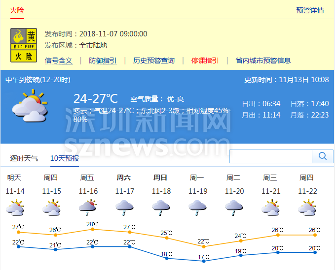 氣象局提醒市民,深圳市日間天氣干燥,火險預(yù)警信號生效中,請在戶外的注意防火。