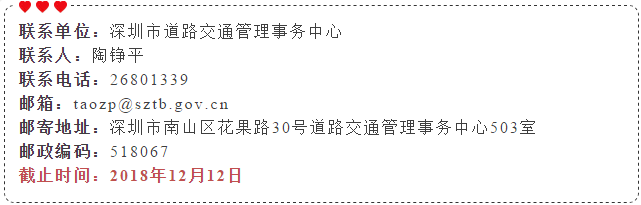 根據(jù)《深圳市機動車道路臨時停放管理辦法》相關(guān)規(guī)定,市交委現(xiàn)就以上18條道路路邊停車泊位設置方案公開征求意見。市民如有意見和建議,可于2018年12月12日前反饋給市交委。郵寄地址為深圳市南山區(qū)花果路30號道路交通管理事務中心503室。