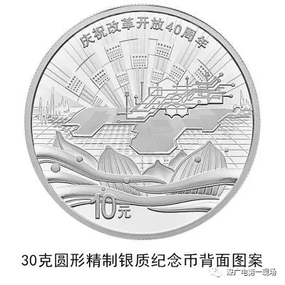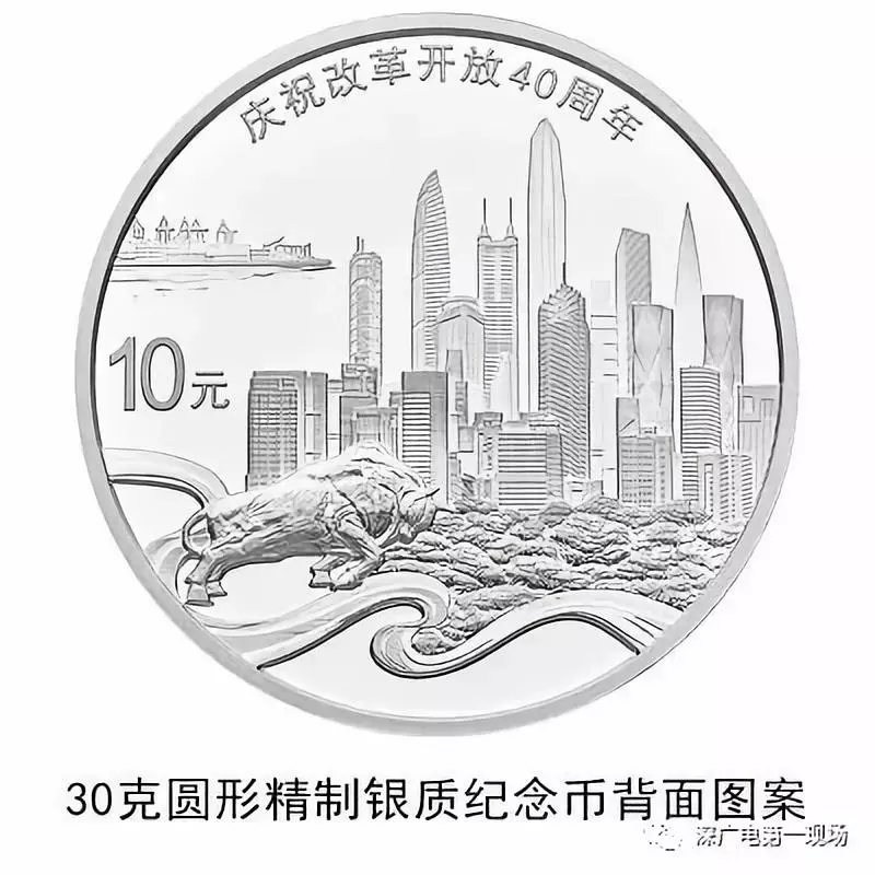 30克圓形銀質(zhì)紀(jì)念幣背面圖案之二為深圳城市建筑、蛇口港、拓荒牛雕塑及飄帶等組合設(shè)計(jì),并刊“慶祝改革開放40周年”字樣及面額。