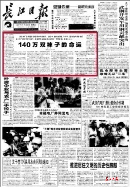 《140萬雙襪子的命運(yùn)》于1997年7月30日首發(fā)于長江日報一版,獨(dú)家報道了武漢襪廠倉庫里積存了兩火車皮襪子,其中最長的沉睡了10年,但是面對眾多商家訂單,工廠卻長年不肯“吐貨”,商家開價越來越低,襪子在一天天貶值。此報道一出,轟動全國,多家媒體轉(zhuǎn)載,并獲得第八屆中國新聞獎一等獎。