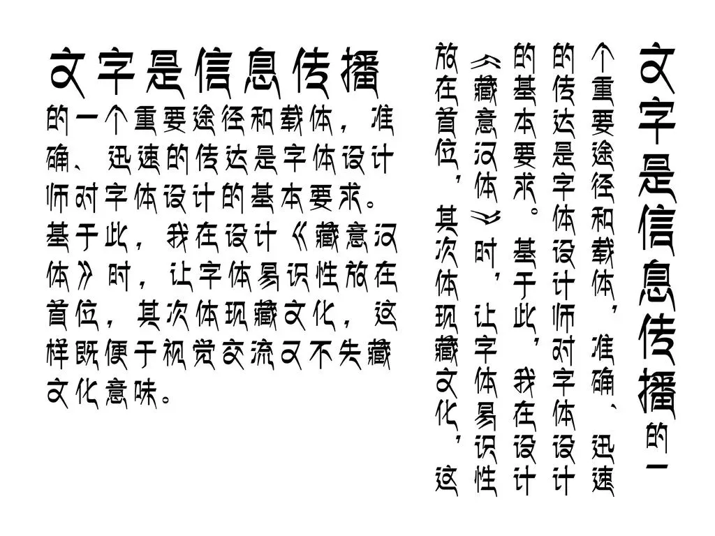 為了設(shè)計(jì)出具有藏文的漢字字體,他不僅自己鉆研,還屢次向西藏當(dāng)?shù)鼐庉嫴匚淖值涞木庉嬋〗?jīng)。后經(jīng)過(guò)一稿、二稿、三稿,反復(fù)的設(shè)計(jì)創(chuàng)作,終于有了《方正藏意漢體》,且作品第一次參賽就獲得大獎(jiǎng),受到業(yè)內(nèi)好評(píng)。