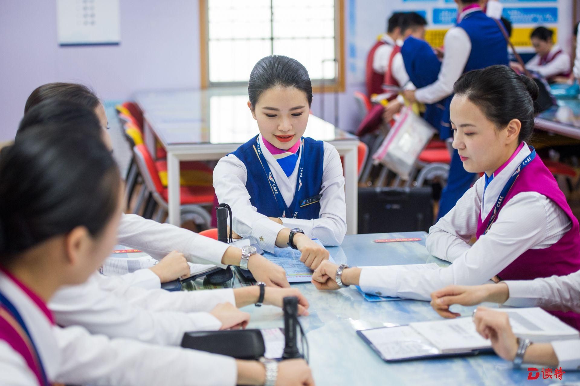 乘務(wù)員們在進(jìn)行航前準(zhǔn)備。