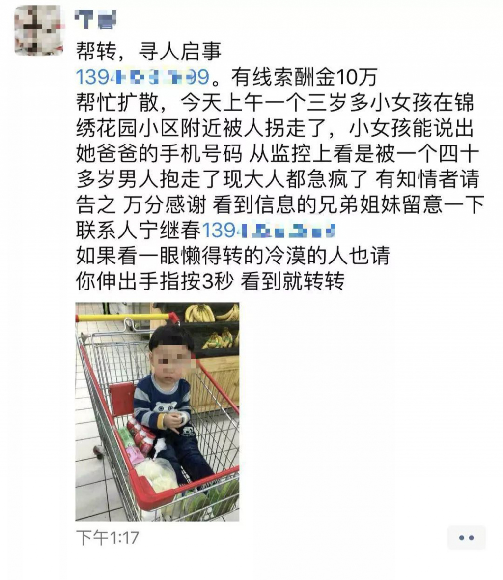 2月10日晚間,不少人的微信朋友圈被一條尋人消息刷屏。消息稱,一名3歲女孩在錦繡花園小區(qū)附近被人拐走,小女孩能說出她爸爸的手機(jī)號碼。從監(jiān)控上看,她是被一名40多歲的男人抱走了。
