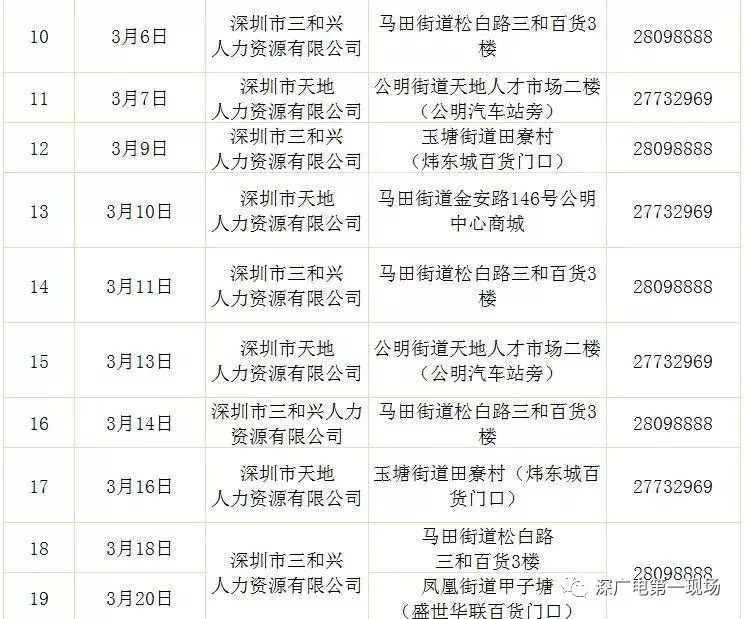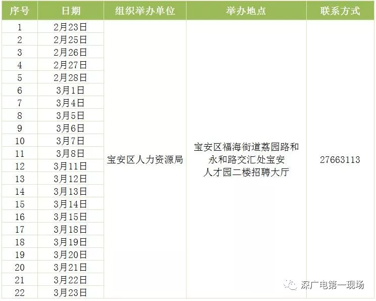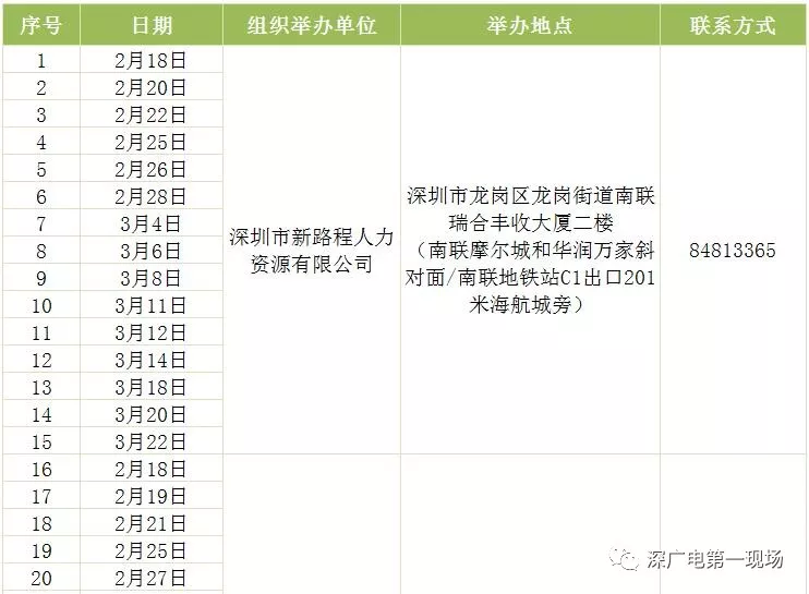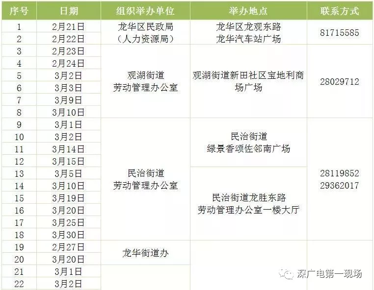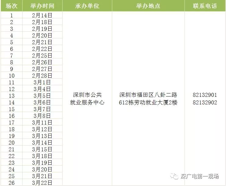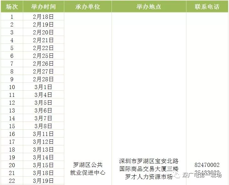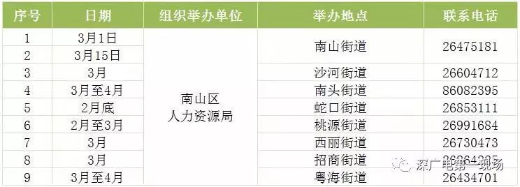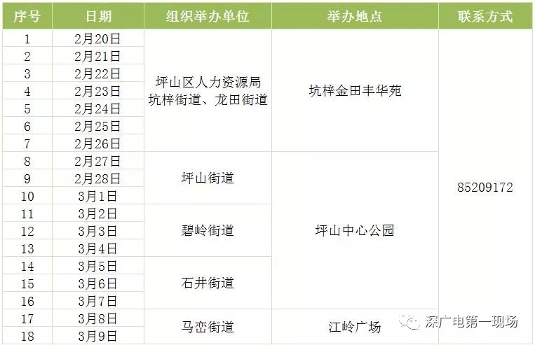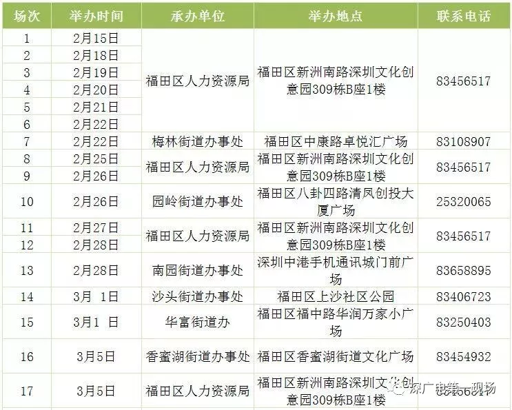 其中,深圳市公共就業(yè)服務(wù)中心26場(chǎng),福田區(qū)27場(chǎng),羅湖區(qū)40場(chǎng),鹽田區(qū)14場(chǎng),南山區(qū)9場(chǎng),寶安區(qū)22場(chǎng),龍崗區(qū)60場(chǎng),龍華區(qū)56場(chǎng),坪山區(qū)18場(chǎng),光明區(qū)25場(chǎng),大鵬新區(qū)9場(chǎng)。