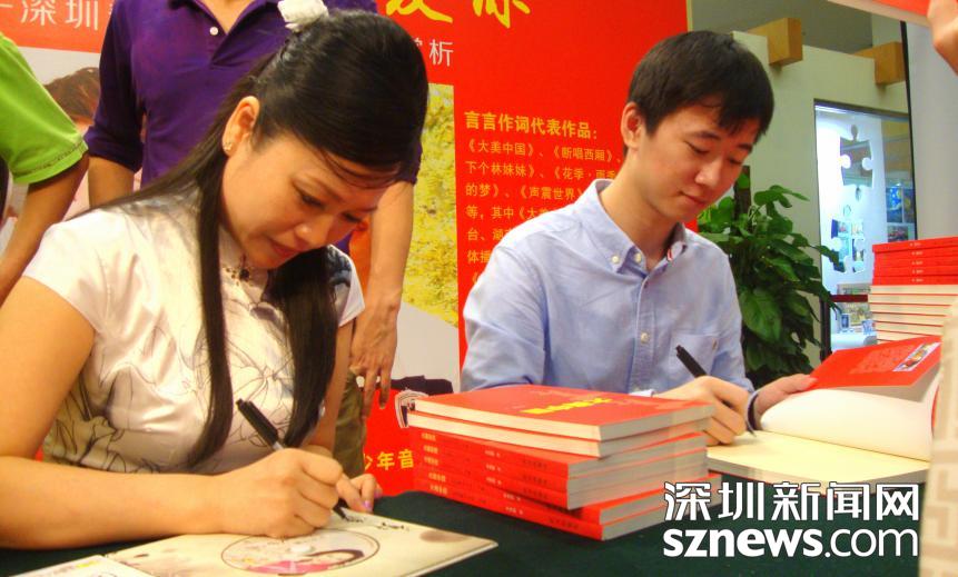 言言與《大美中國(guó)》的演唱者、歌唱家鄭海燕(圖左)為觀眾簽送唱片和詩集