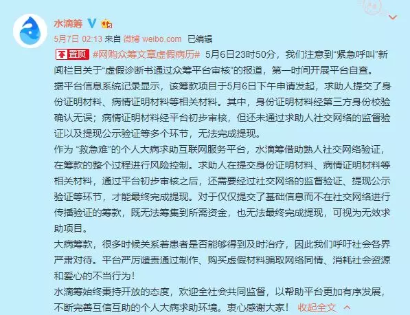 水滴籌官方微博稱,據(jù)平臺信息系統(tǒng)記錄顯示,記者提交的虛假眾籌款項目于5月6日下午申請發(fā)起,求助人提交了身份證明材料、病情證明等相關(guān)材料。