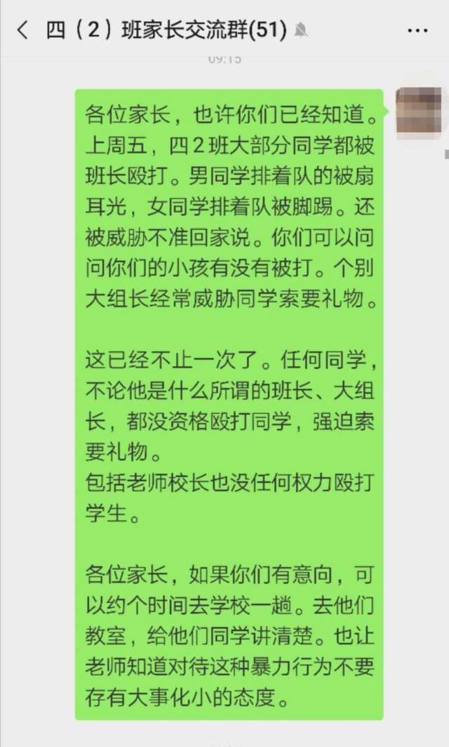 據(jù)女兒反映,當天上午課間時分,班長(女)將班上的學生集合在一起,以違反紀律為由要體罰他們?!叭嗝麑W生排著隊被班長毆打,男生被扇耳光,女生被腳踢。”