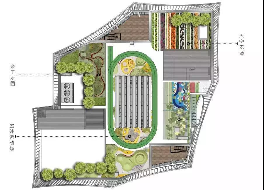 屋頂農(nóng)場充分利用空間,打造天空農(nóng)場、親子樂園、屋外運動場??罩械呐艿溃饰值耐寥?,瓜果蔬菜的金色豐收,讓自然在城市落地生根。小朋友們可以在其中,種植汗水,開花結(jié)果,收獲自然的饋贈。