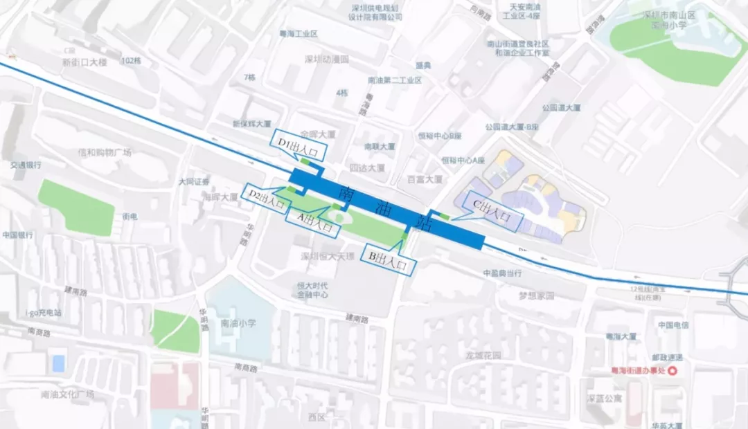 9號(hào)線二期南油站位于南山區(qū)南海大道與登良路交叉口下方,沿南海大道呈南北向敷設(shè),為地下2層車站,地下一層為站廳層,地下二層為站臺(tái)層,車站總長(zhǎng)334m,車站出入口共計(jì)5個(gè)A出入口、B出入口、C出入口、D1出入口、D2出入口。B出入口位于恒大天璟北側(cè),C出入口位于來(lái)福士廣場(chǎng)一側(cè)登良路與南海大道交匯處,D1出入口位于金暉大廈東側(cè),A、D2出入口位于南海大道與華明路交匯處。