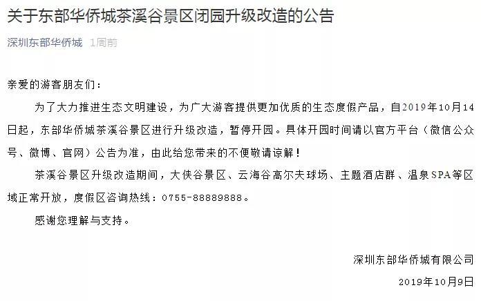 據(jù)深圳東部華僑城官方微博消息,自2019年10月14日起,東部華僑城茶溪谷景區(qū)進行升級改造,暫停開園。