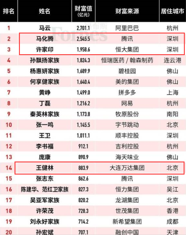 福布斯發(fā)布2019中國富豪榜,馬云馬化騰許家印前三,王健林從去年的第4位跌至第14位
