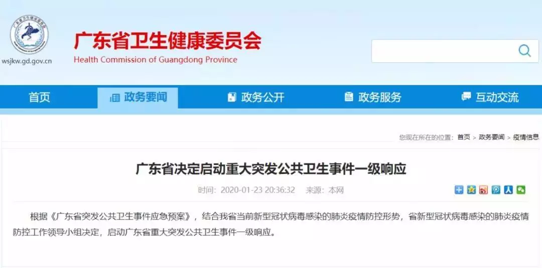 廣東省衛(wèi)健委1月23日晚發(fā)布通告:根據《廣東省突發(fā)公共衛(wèi)生事件應急預案》,結合我省當前新型冠狀病毒感染的肺炎疫情防控形勢,省新型冠狀病毒感染的肺炎疫情防控工作領導小組決定,啟動廣東省重大突發(fā)公共衛(wèi)生事件一級響應。