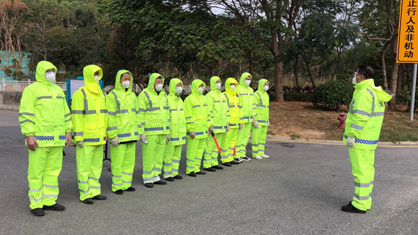 目前,燕羅街道各社區(qū)將庫存的防水材質(zhì)三防防護(hù)服全部送到一線,隊(duì)員們穿著時(shí)將袖口、脖口的鎖口扎緊,褲子選取大一碼的方便遮住腳面,同時(shí)佩戴護(hù)目鏡、口罩、一次性手套、一次性鞋套,對全身進(jìn)行包裹。換班時(shí),利用配置好的消毒水全面噴淋,或是在消毒桶里浸泡不少于20分鐘,并在太陽下掛起晾曬。