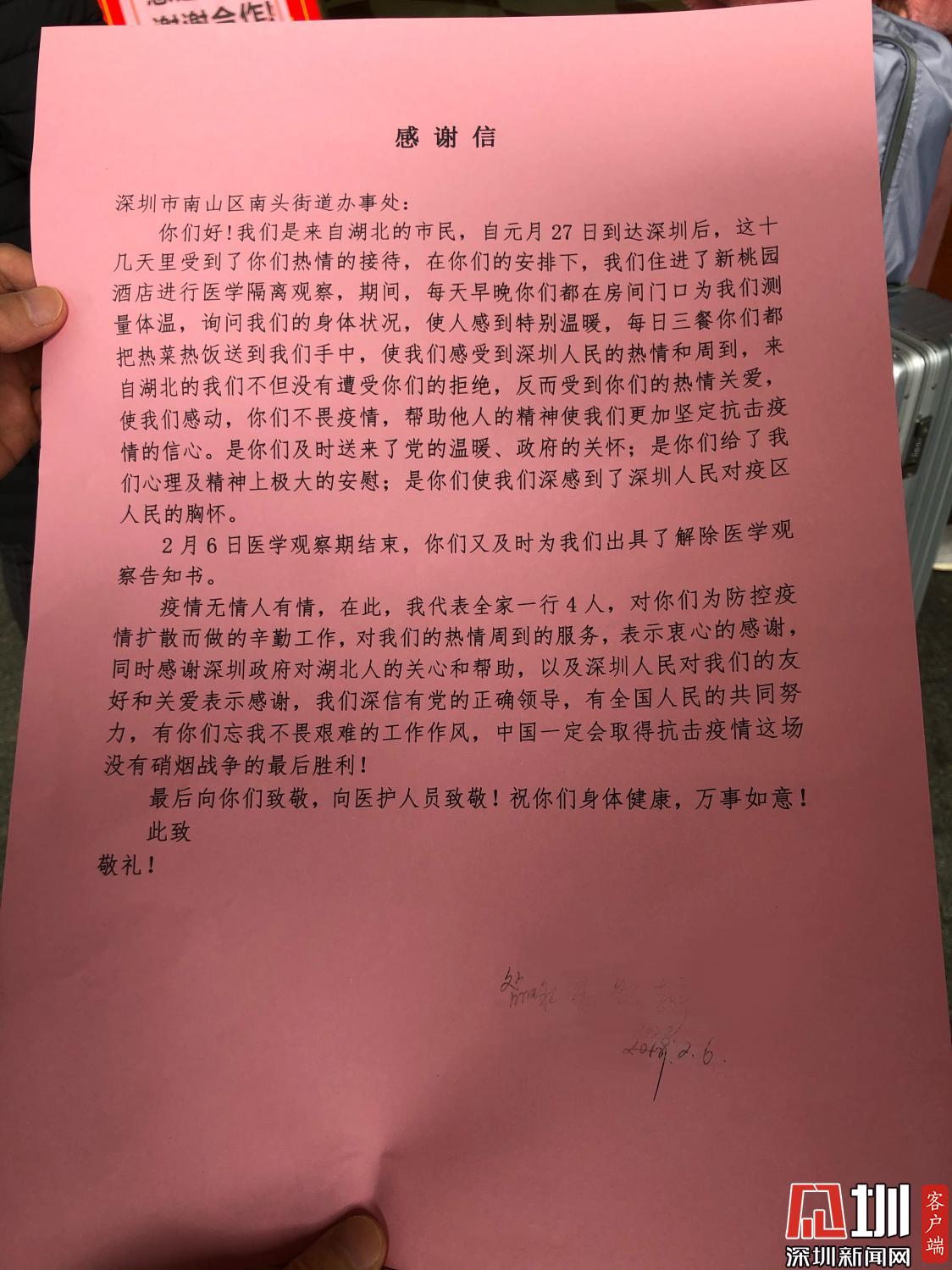 2月6日醫(yī)學(xué)觀察期滿(mǎn),經(jīng)檢測(cè)他們一家并無(wú)不適癥狀,衛(wèi)健局駐點(diǎn)人員為其出具了解除醫(yī)學(xué)觀察告知書(shū)。李女士拉著行李滿(mǎn)眼淚花說(shuō)道:“深圳各級(jí)政府部門(mén)高效實(shí)干,深圳的工作人員很熱心很細(xì)心,疫情猖獗時(shí),人間自有真情在,真的感謝你們?!?/span>