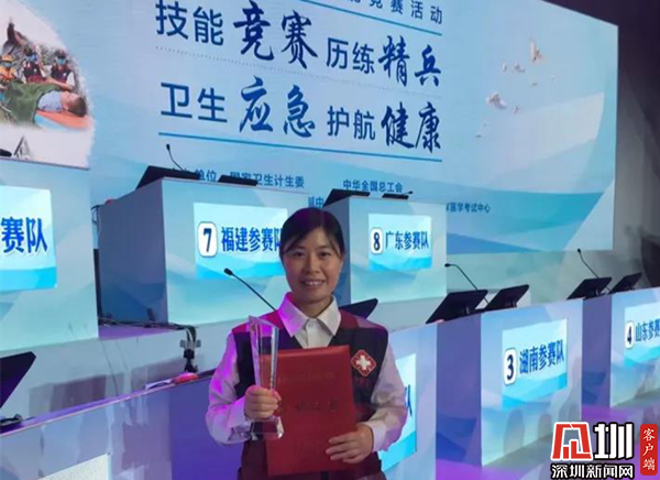 曠翠萍在全國(guó)衛(wèi)生應(yīng)急技能大賽獲獎(jiǎng)現(xiàn)場(chǎng)。
