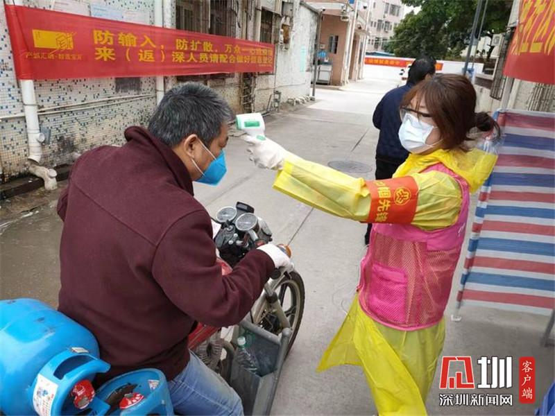 來自龍崗區(qū)南嶺村的鄧育芳,是不少租戶的房東,也是值守在南嶺南路黨員先鋒崗的一名村民志愿者。連續(xù)十多天,她每天在村口站立整整7個(gè)小時(shí),不停為出入居民測量體溫、詢問來源地、查驗(yàn)申報(bào)二維碼、引導(dǎo)注冊。