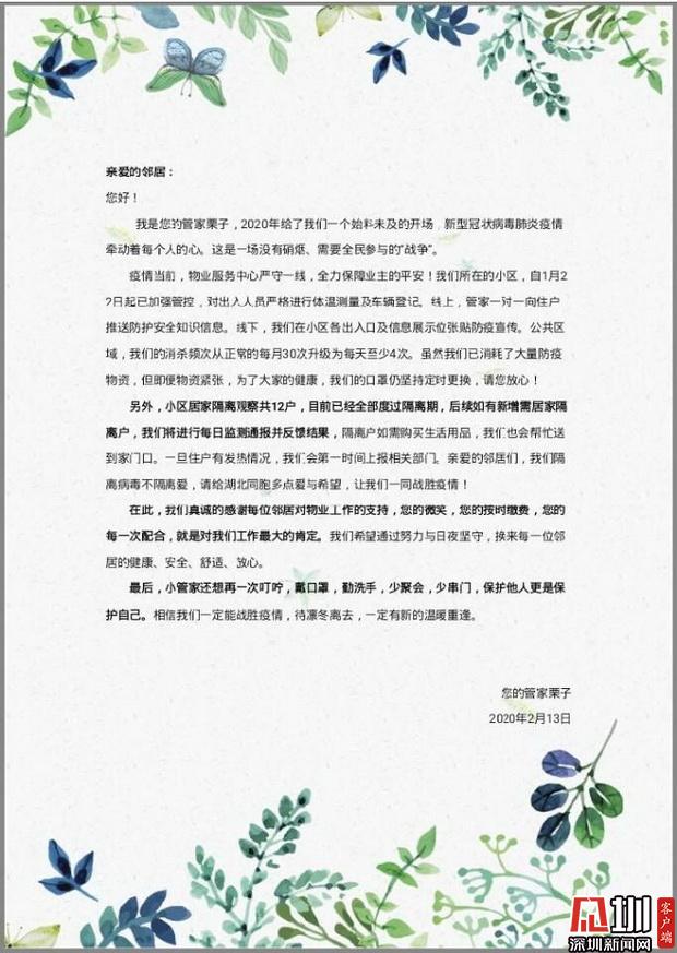 見圳客戶端·深圳新聞網(wǎng)2020年2月13日訊(見圳客戶端·深圳新聞網(wǎng)記者 潘潤華)“他們對疫情的恐懼并不少半分,可卻堅持在工作崗位。”“他們就是我們心目中的逆行者。守護著我們的安全?!苯?,一幕幕暖心畫面在深圳上演,不少業(yè)主紛紛踴躍為物業(yè)員工捐款,以表達(dá)對這些“平安守護者”“逆行人”的謝意。