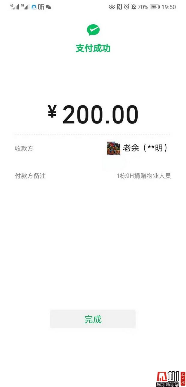 日前,深云村居民在微信群里討論小區(qū)防疫工作時,談到物業(yè)服務(wù)中心在防疫工作中投入大量人力物力,在防疫物資和人員不足的情況下加班加點地工作,有居民提議想對小區(qū)物業(yè)服務(wù)中心防疫一線的工作人員進行“打賞”,表達(dá)對他們的感激之情。深云村業(yè)委會聞訊后,迅速對這一提議進行了跟進討論,并于2月6日向小區(qū)居民發(fā)出《關(guān)于為深云村物業(yè)服務(wù)中心防疫一線員工打賞的倡議書》,呼吁小區(qū)居民以戶為單位通過手機掃碼的方式向特定賬戶“打賞”,得到居民的熱烈響應(yīng)。據(jù)了解,截至2月12日16:47,該小區(qū)居民共打賞982筆,總金額達(dá)119237.54元。