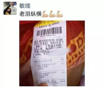1月30日晚上8點56分,華中科技大學(xué)協(xié)和深圳醫(yī)院(南山醫(yī)院)手外科護(hù)士王敏在朋友圈曬了一張照片,照片里是一個紅色塑料袋上貼著一張外賣單,備注上寫著,“南山醫(yī)院發(fā)熱門診的醫(yī)務(wù)工作者們,你們辛苦了!請收下一個普通市民的一點點心意,加油,肺炎必?。 ?/p>