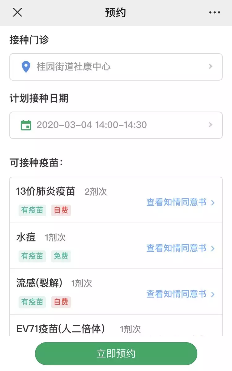 2.成功關(guān)聯(lián)寶寶后,點擊立即預(yù)約,選擇接種機(jī)構(gòu)及計劃接種日期,查看可接種疫苗的針次及疫苗庫存,確認(rèn)無誤后立即預(yù)約。