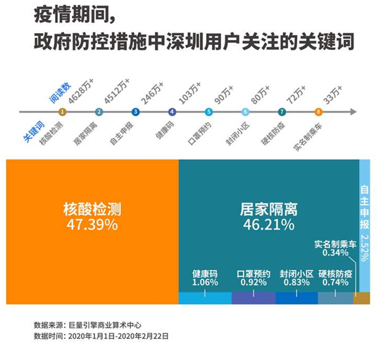 深圳市的具體防控舉措也被今日頭條深圳區(qū)域用戶高頻關注。數(shù)據(jù)顯示,免費的核酸檢測關注度排名第一,閱讀數(shù)達到4628萬次。為了防范病毒的社區(qū)傳播,2月12日起,深圳市對于居家隔離觀察人員全面展開了病毒免費合作檢測工作。隔離者的確定集合了街道的逐戶排查和住戶的自主申報,結合住戶的行程軌跡,最大程度避免遺漏。