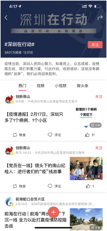 今日頭條話題#全民共抗肺炎深圳在行動#共計3401萬閱讀量,文章參與數(shù)130余篇。