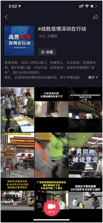 疫情防控期間,深圳市的政務頭條號和政務抖音號也“大放異彩”。以今日頭條和抖音兩個熱門平臺來看,抖音話題#戰(zhàn)勝疫情深圳在行動#截至2月26日已累計1.6億次播放,參與視頻數(shù)262個。