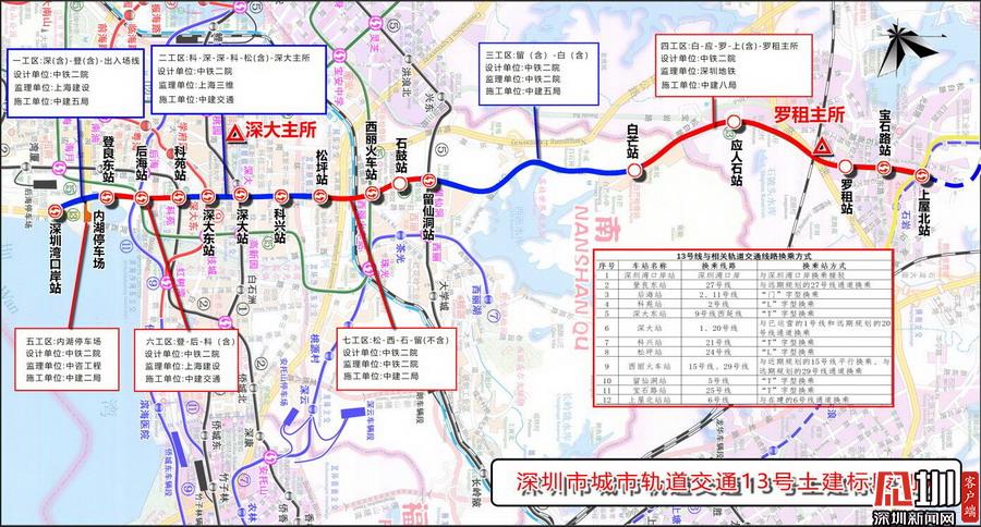據(jù)了解,地鐵13號線由南至北穿過南山區(qū)、寶安區(qū)和光明新區(qū)。項目共設(shè)車站16座,線路總長22.436公里,出入線與后海站接軌,將穿越已運營的地鐵1號線、2號線、5號線、11號線。由于沿途工程地質(zhì)條件復雜、換乘站多、工程實施難度大、長區(qū)間盾構(gòu)、拆遷工作繁重、交通疏解復雜等原因,13號線被稱為深圳地鐵建設(shè)史上最難的地鐵線路之一。