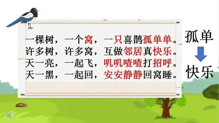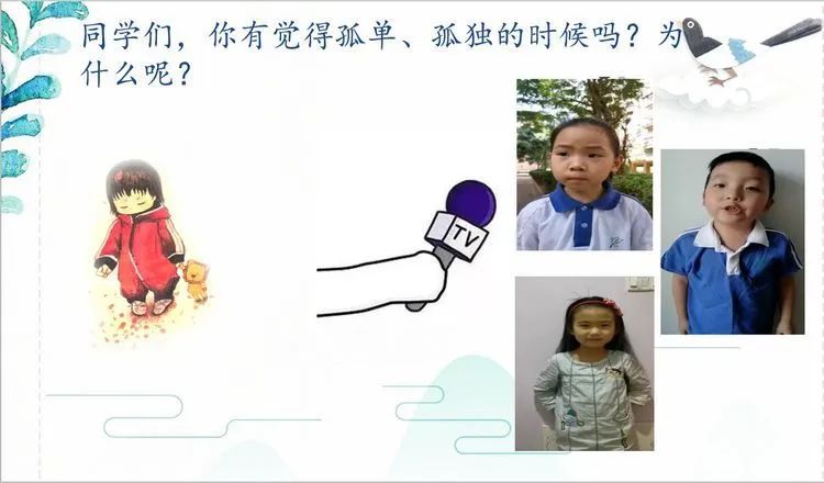 在劉老師的課堂上,她帶來《樹和喜鵲》故事中主人公小喜鵲日記本獎勵讀書流利、情感充沛的孩子們。通過小喜鵲的日記,婉儀老師將課堂成功地轉(zhuǎn)接到課文的文本當(dāng)中。進(jìn)而有對文章中出現(xiàn)的事物、事物所具備的特點展開了細(xì)致而有趣的學(xué)習(xí)。期間,婉儀老師還化身小記者,用三段對于自己學(xué)生的采訪視頻,讓學(xué)生對于“孤單”二字有了更加深刻的理解。