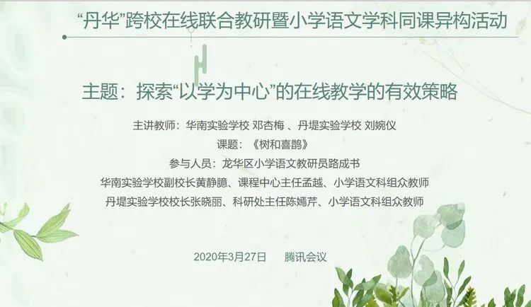 見圳客戶端、深圳新聞網(wǎng)2020年3月31日訊 (記者 潘寶儀)丹堤實驗學(xué)校與華南實驗學(xué)校異苔同岑,相聚“丹華”,以鄧杏梅老師與劉婉儀老師關(guān)于《樹和喜鵲》的同課異構(gòu)為課例,開展了丹華跨?!耙詫W(xué)為中心”的小學(xué)語文在線教學(xué)策略研討會。